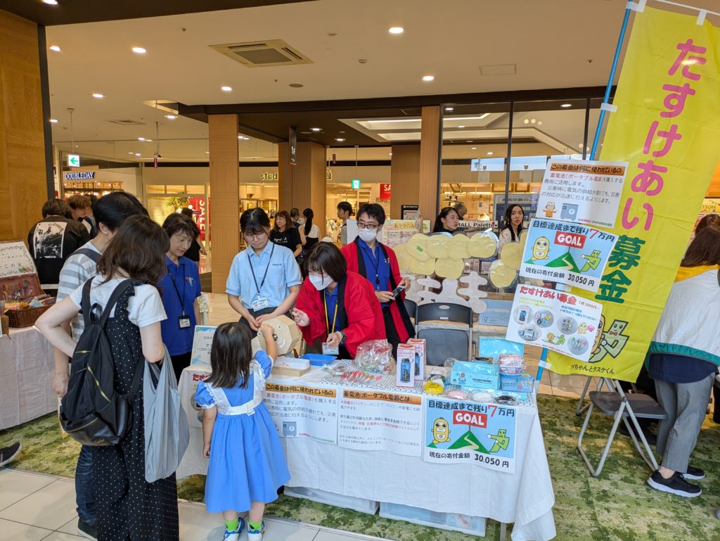 今回、私たち社協ではこのイベントで、災害時などに活用できる“畜電池(ポータブル電源)”の購入を目指して『たすけあい募金』を実施しました。