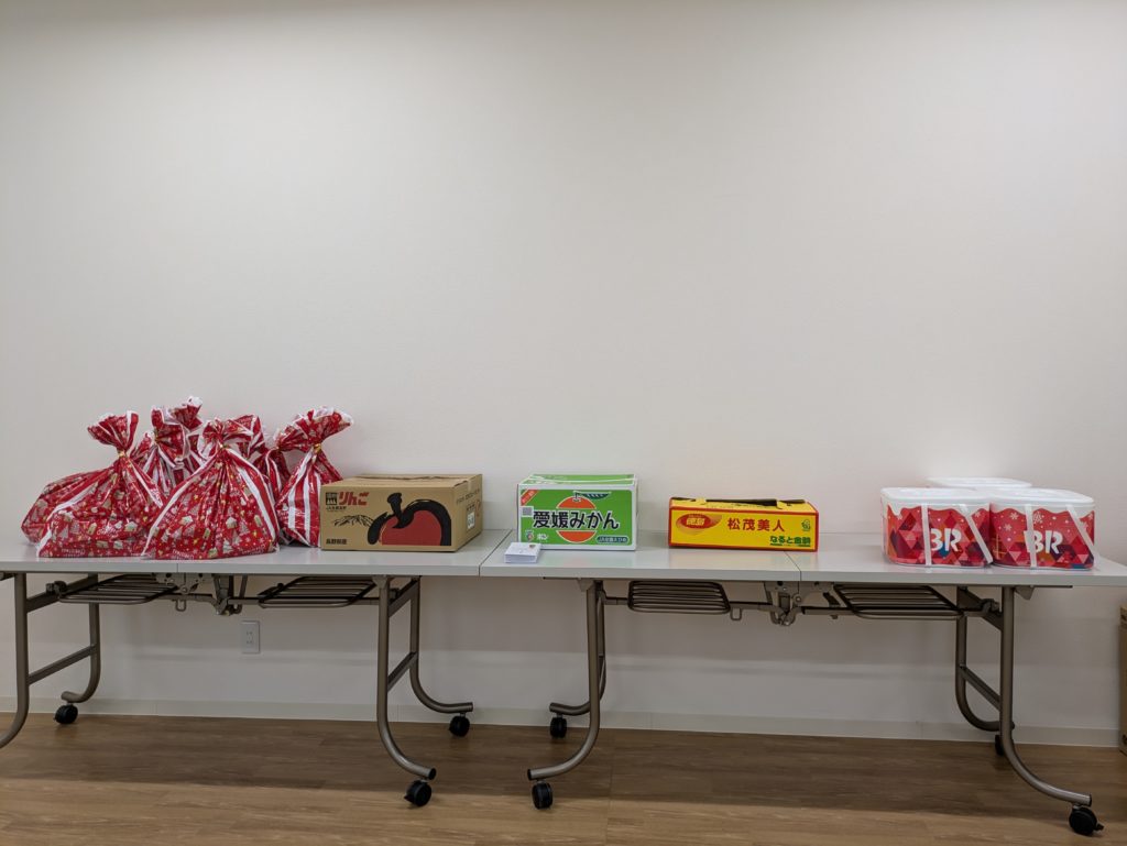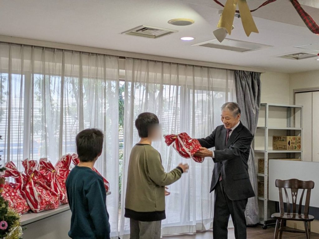 施設の子どもたちに「歳末たすけあい募金」の一部を活用してクリスマスのお菓子と併せてご寄付いただいたアイスケーキや果物、タオル等も一緒にお届けしました。
