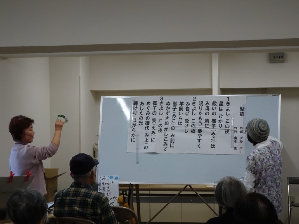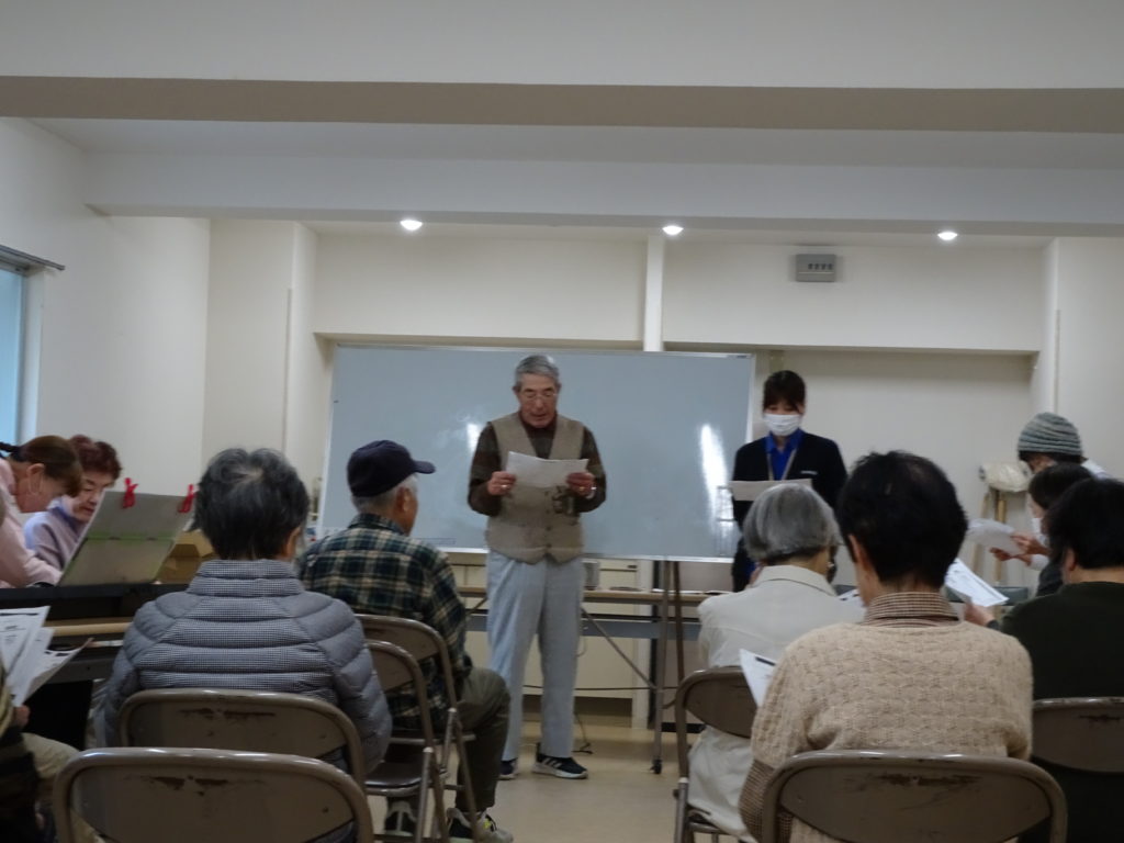 地域包括支援センター所長のお話、スタッフによるおもしろクイズとトークや健康体操の後、童謡・唱歌・懐メロ等をキーボード伴奏で11曲を歌いました。
