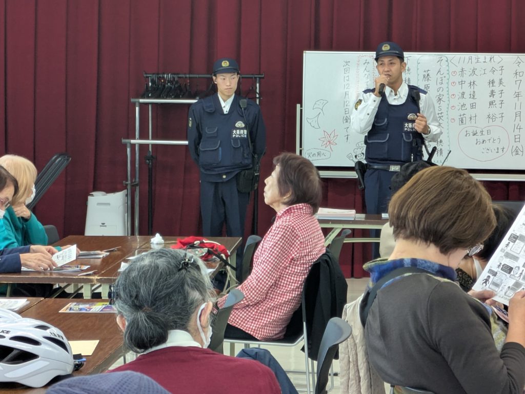 引き続いて茨木警察署下穂積交番より特殊詐欺被害防止と交通事故防止(自転車)の