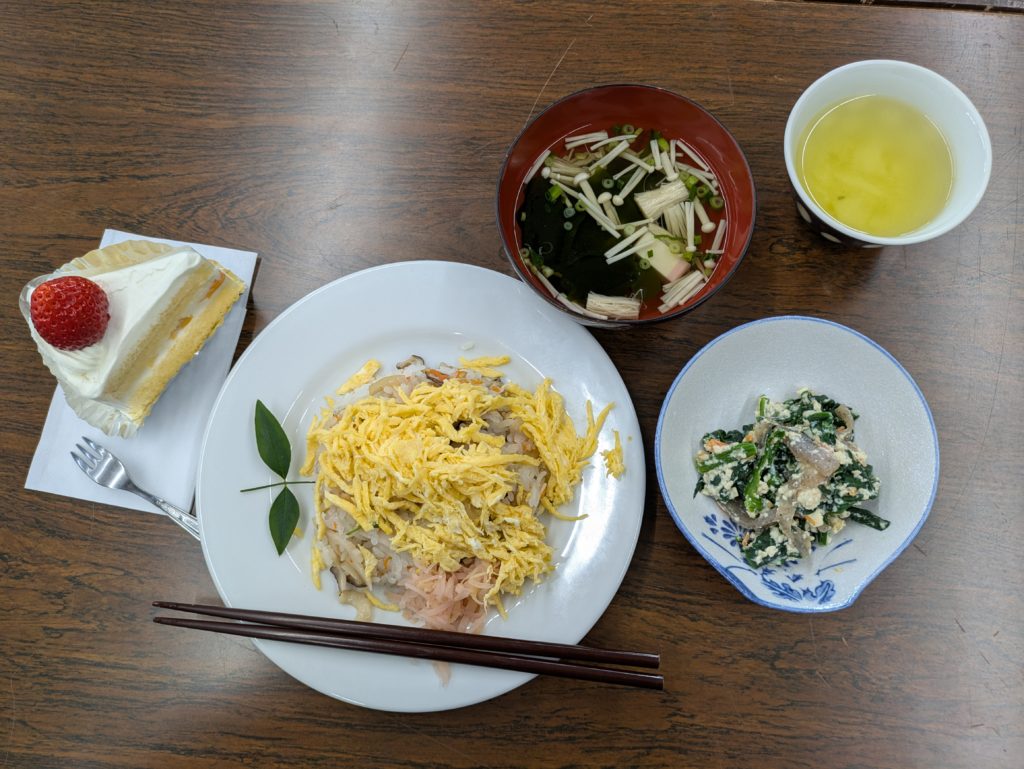 今月の献立はバラ寿司と和え物とわかめとえのきのすまし汁にクリスマスケーキと紅茶でした。