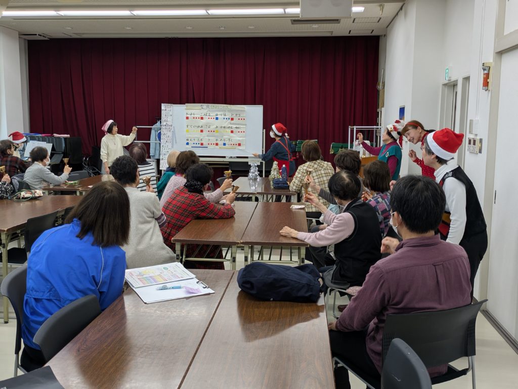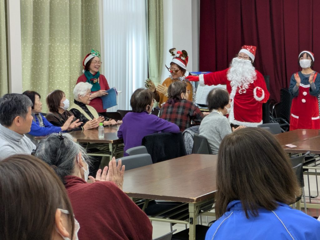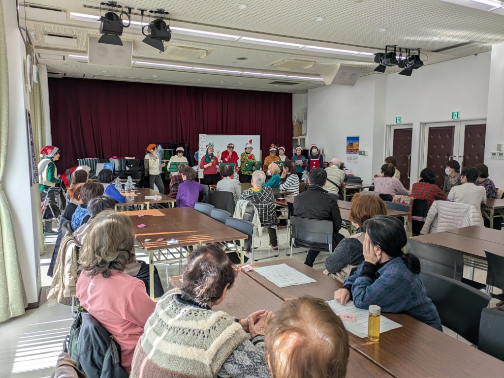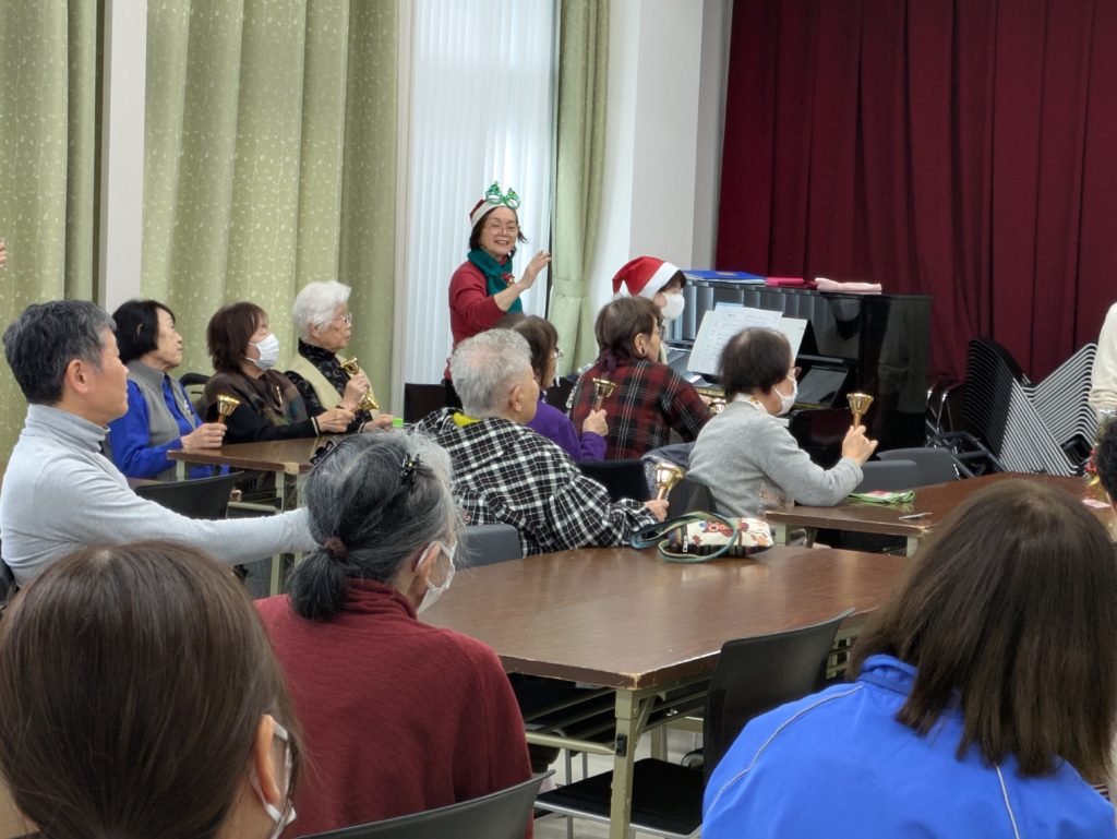 そして年末恒例となったコーラスグループ プチケーキさん10名(福祉委員3名含む)を迎えてハンドベル演奏やコーラスと一時間たっぷり楽しんでいただきました。