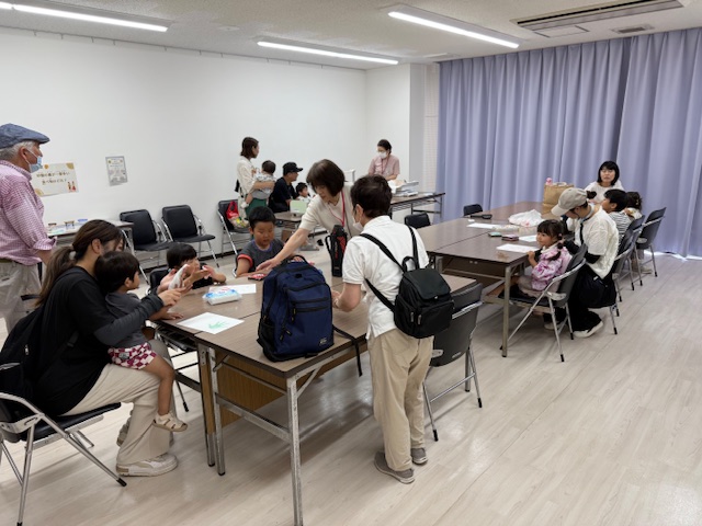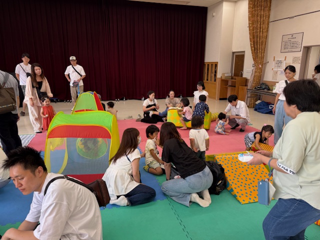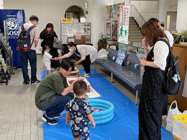 ギラギラ太陽のまぶしい7月12日(土)午前10時から、玉島公民館で『“わいわい”どようび』を開催しました。未就学児を対象にお子さま61人、保護者63人の方がいらっしゃいました。お子さま1人に1人以上の保護者。ママだけでなくパパや祖父母も参加され、子育てへの関心の高さを感じました。