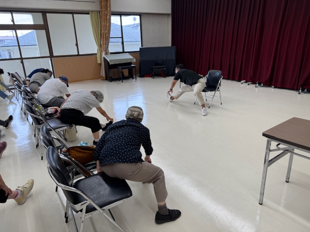 健康体操はサンスポーツ茨木の杉山さんに指導をしていただきました。シニアの皆さん、とっても意欲的です。イスに座った状態で頭を右に傾け首をゆっくりまわしほぐしました。右腕を伸ばし左腕肘で抱え込みます、上体を左へゆっくりひねって肩や脇の筋肉を伸ばします、反対側も同様に行います。右腕を上に上げ、もう一方の腕で引っ張って伸ばします。