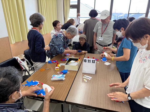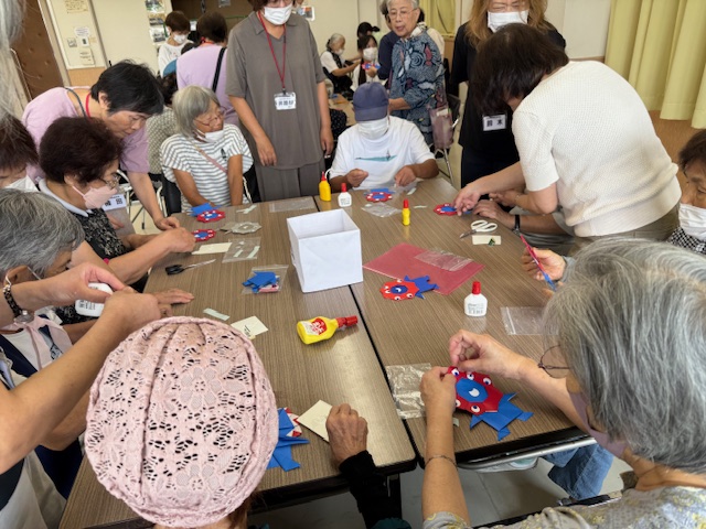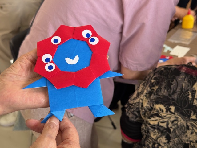 小物作りでは、現在開催をされている関西万博のイメージキャラクターのミャクミャクを折り紙で作りました。個性的なキャラクターで目が5つ、目の位置で作った人の個性がでるミャクミャクが仕上がり、シニアの皆さん見せ合いをしていました。