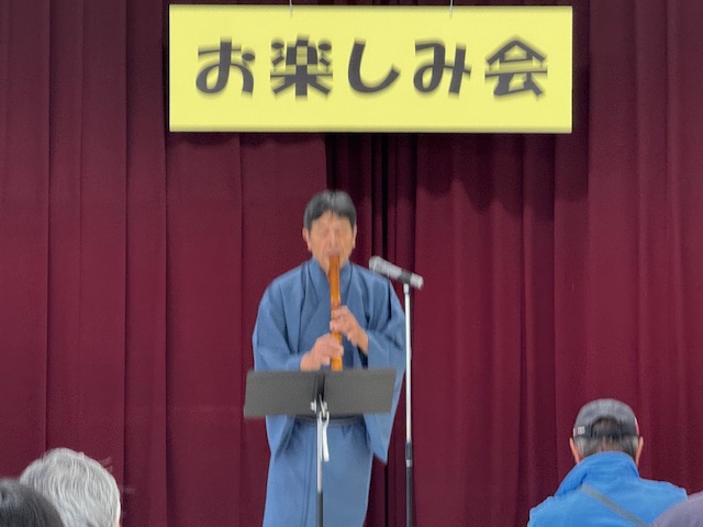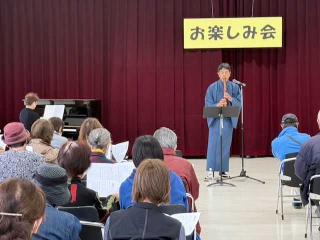 また、友情出演で福祉委員の瀧山勢香さんも入って一緒に尺八を伴奏されてシニアの皆さんも大きな声を出して歌われていました。