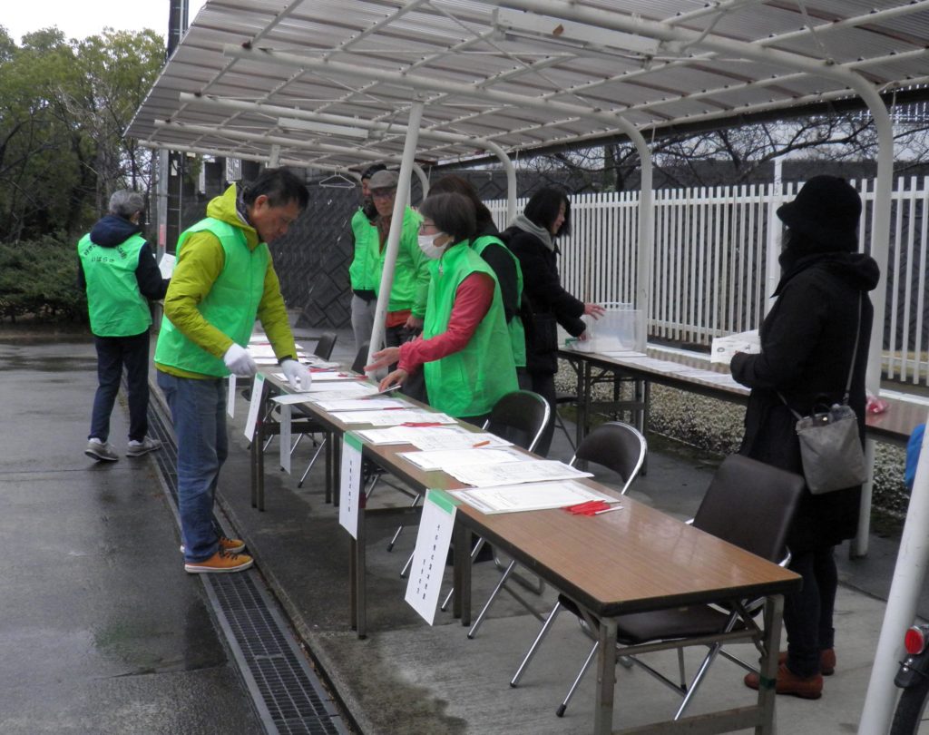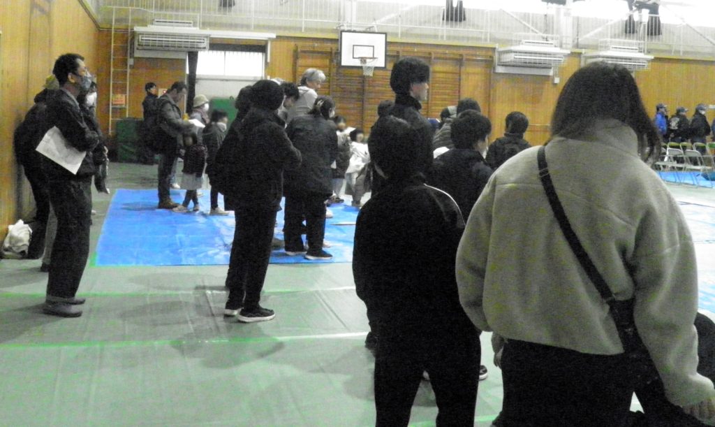 閉会式後は、皆さんアンケートを書いて、啓発物品と豚汁とおにぎりをいただきました。その頃には雨もほとんど止んでいたので、訓練の話を楽しそうにしながら豚汁等を外でいただきました。参加者が帰った後は、体育館のビニールシートを片付けて、台所もきれいにして解散となりました。担当の皆さんは、終了後はほっとした表情でした。