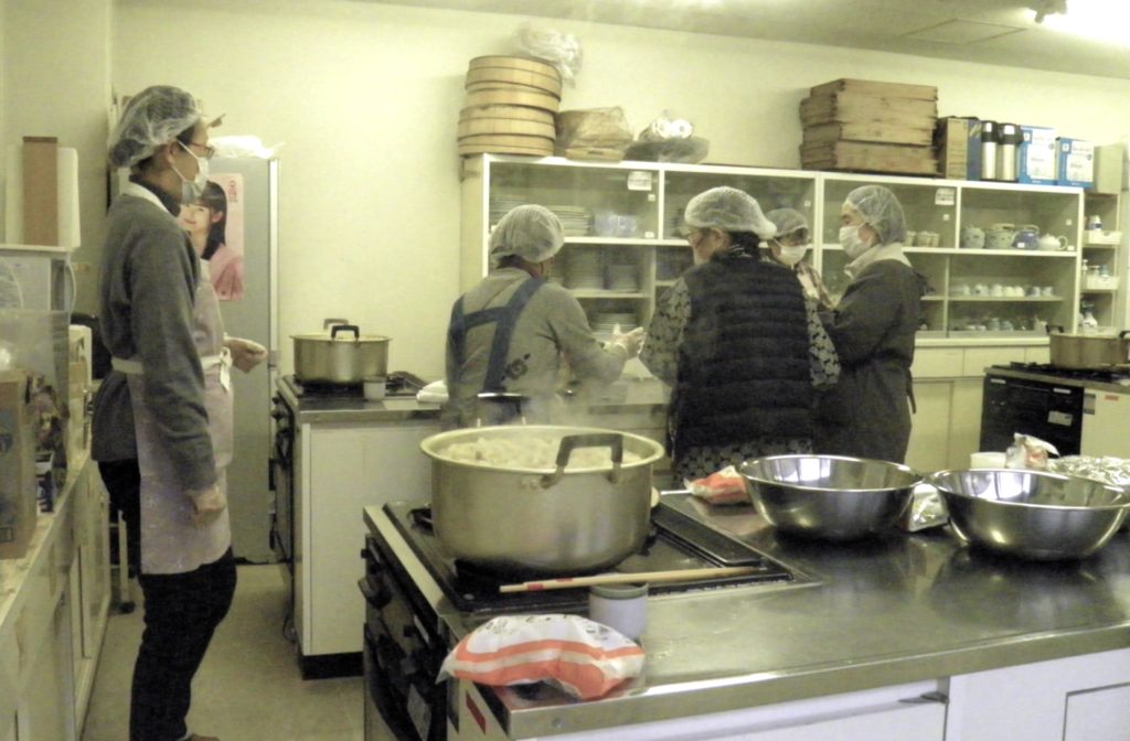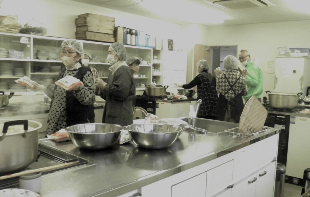 例年、外で実施している釜での炊き出し訓練は雨天の下では無理なので、西公民館の調理室内でたくさんのお鍋を使用しての豚汁とおにぎり制作になりました。どんな状況になっても対応ができる福祉委員のベテランさんたちが、新しい福祉委員さんたちと一緒に前日から下ごしらえと当日のお料理の準備をしました。