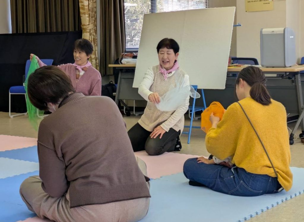 場に慣れてきた頃に、子育てボランティアさんたちの楽しい親子で体全体を使う遊びや、パネルシアター、布を使った遊び、パラバルーンを楽しみました。