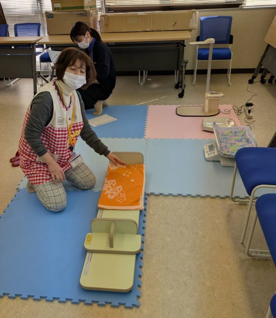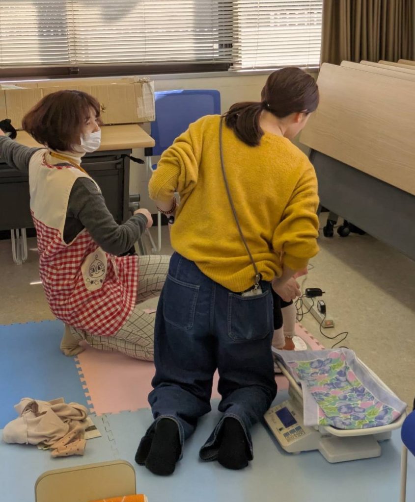 保健師さんたちが身長体重測定器を準備してくださっていました。子どももお母さんと保健師さんに支えられながら計測をしてもらいました。