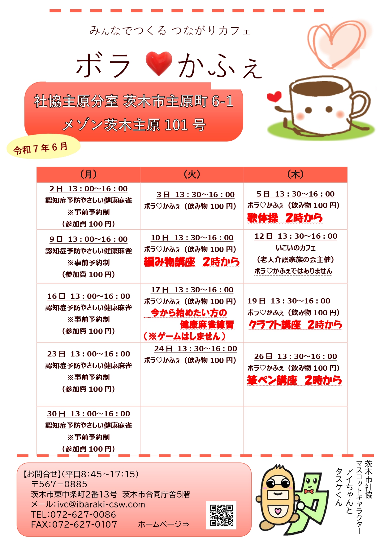 25.5.9 / 最終更新日時 : 25.5.23 茨木市社会福祉協議会 ボラ♡かふぇ イベント詳細 このイベントは26 6月 2025に終了しました 日付: 25.6.5 1:30 PM – 4:00 PM25.6.19 1:30 PM – 4:00 PM25.6.26 1:30 PM – 4:00 PM