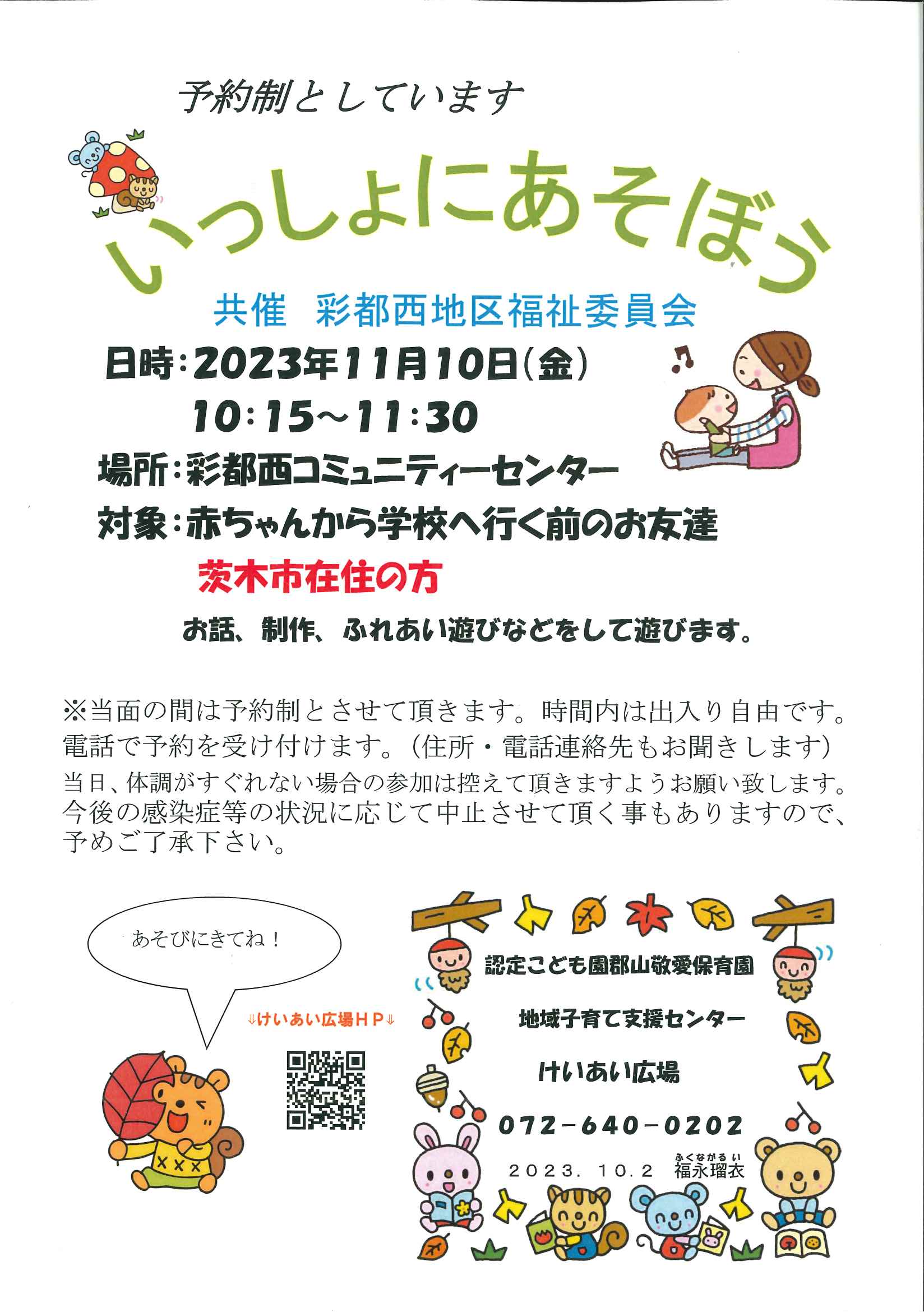 【申込受付中】彩都西地区 子育てサロン いっしょにあそぼう