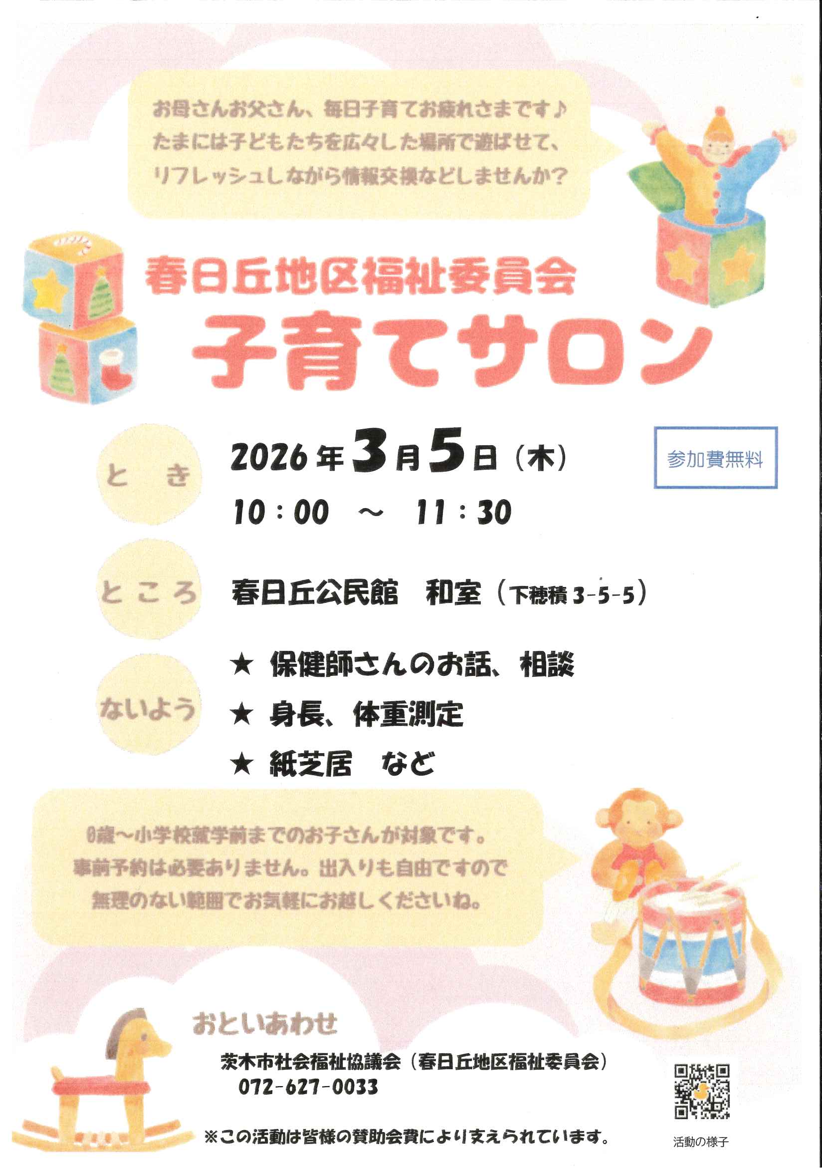 26.2.19 / 最終更新日時 : 26.2.19 茨木市社会福祉協議会 子育てサロン 春日丘地区子育てサロン イベント詳細 日付: 26.3.5 10:00 AM – 11:30 AM カテゴリ: 子育てサロン