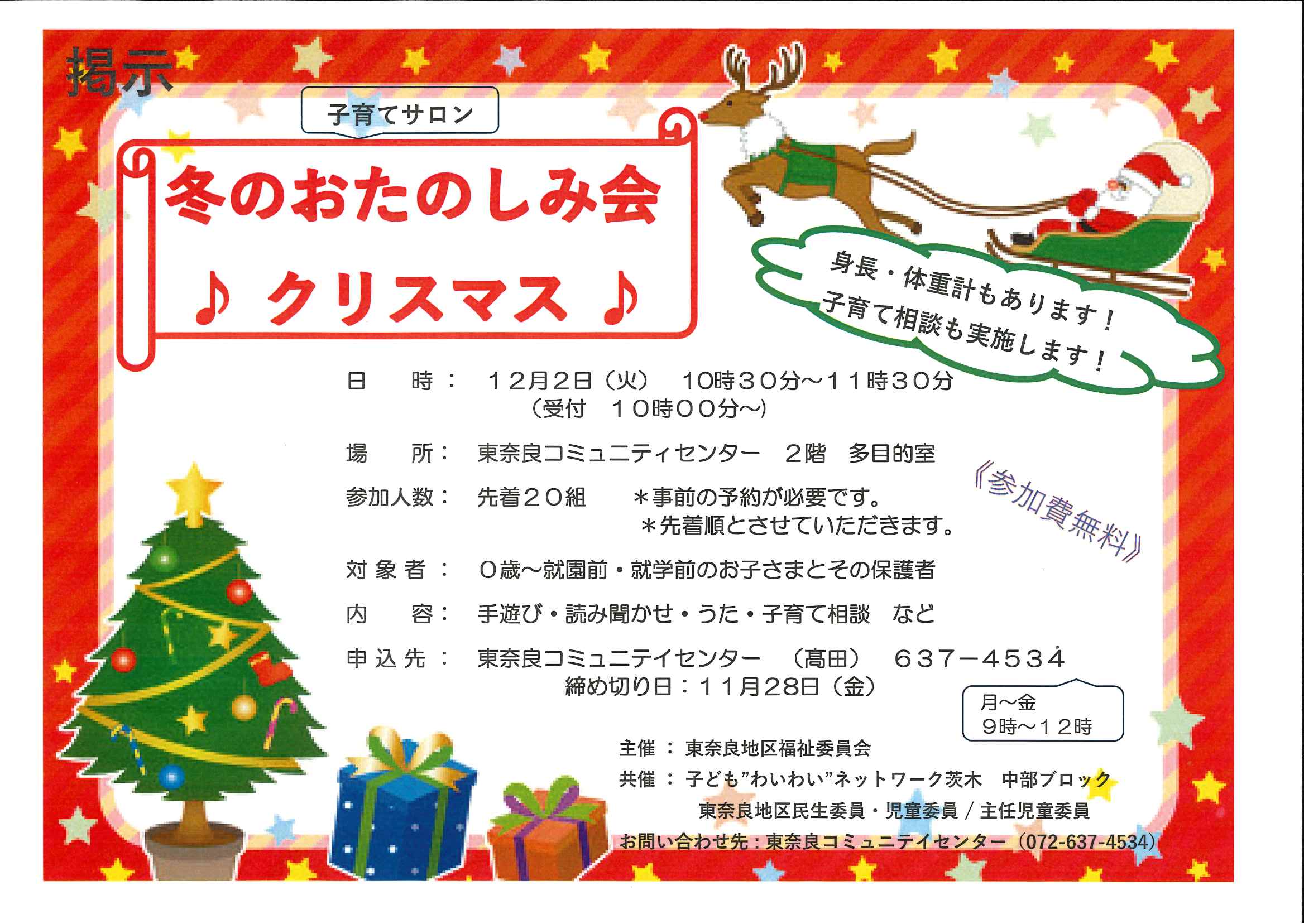 25.11.25 / 最終更新日時 : 25.11.25 茨木市社会福祉協議会 子育てサロン 東奈良地区 子育てサロン 冬のおたのしみ会 ♪クリスマス♪ イベント詳細 日付: 25.12.2 10:30 AM – 11:30 AM カテゴリ: 子育てサロン