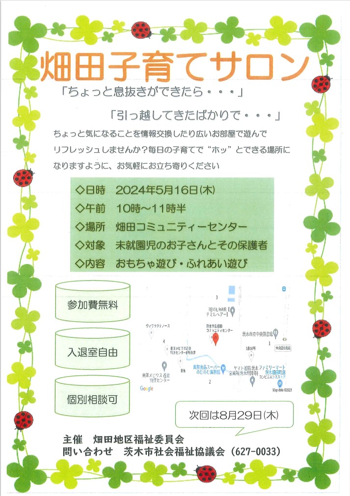 24.4.10 / 最終更新日時 : 24.4.26 茨木市社会福祉協議会 子育てサロン 畑田地区子育てサロン イベント詳細 日付: 24.5.16 10:00 AM – 11:30 AM カテゴリ: 子育てサロン