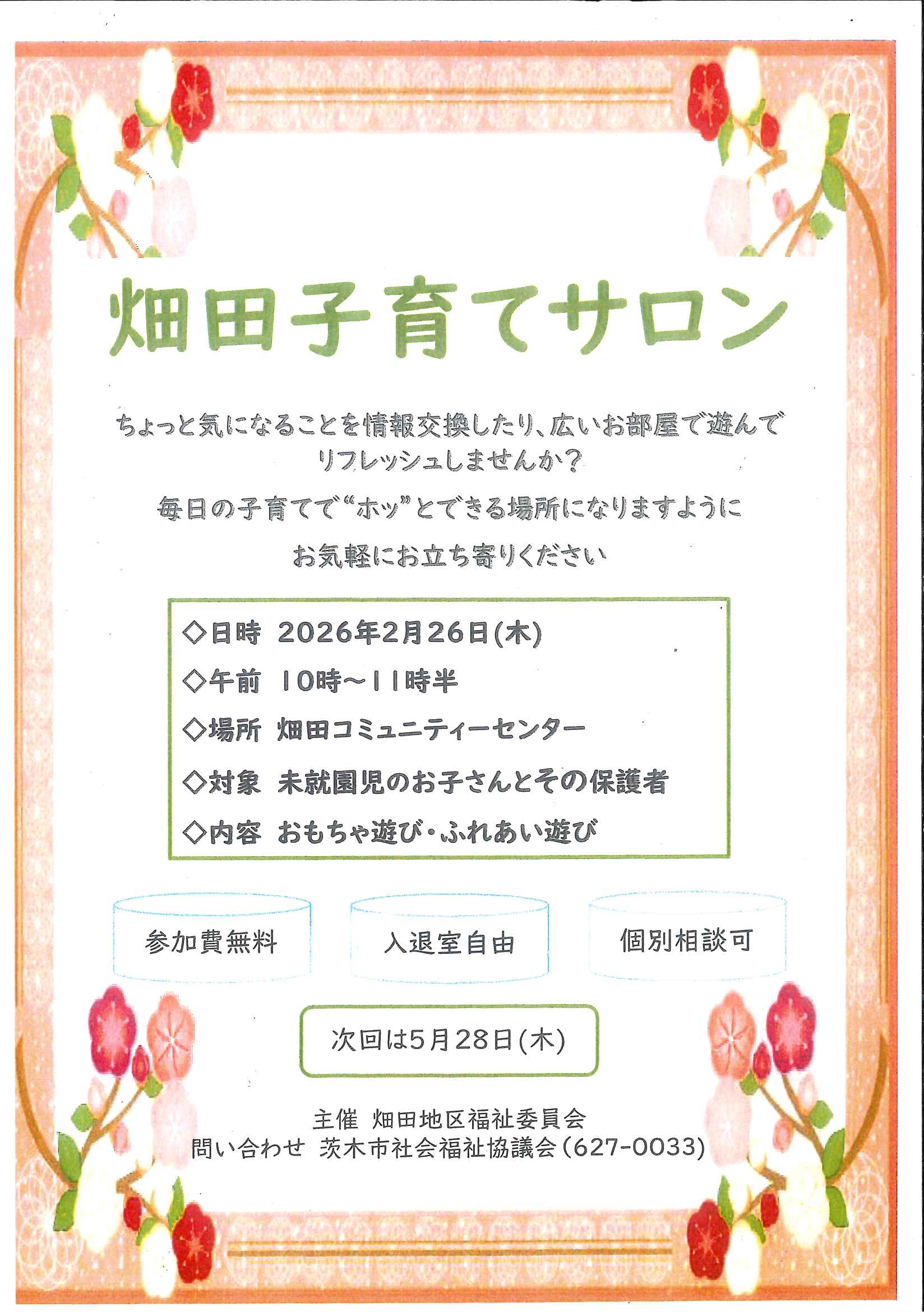 26.2.20 / 最終更新日時 : 26.2.20 茨木市社会福祉協議会 子育てサロン 畑田地区子育てサロン イベント詳細 日付: 26.2.26 10:00 AM – 11:30 AM カテゴリ: 子育てサロン