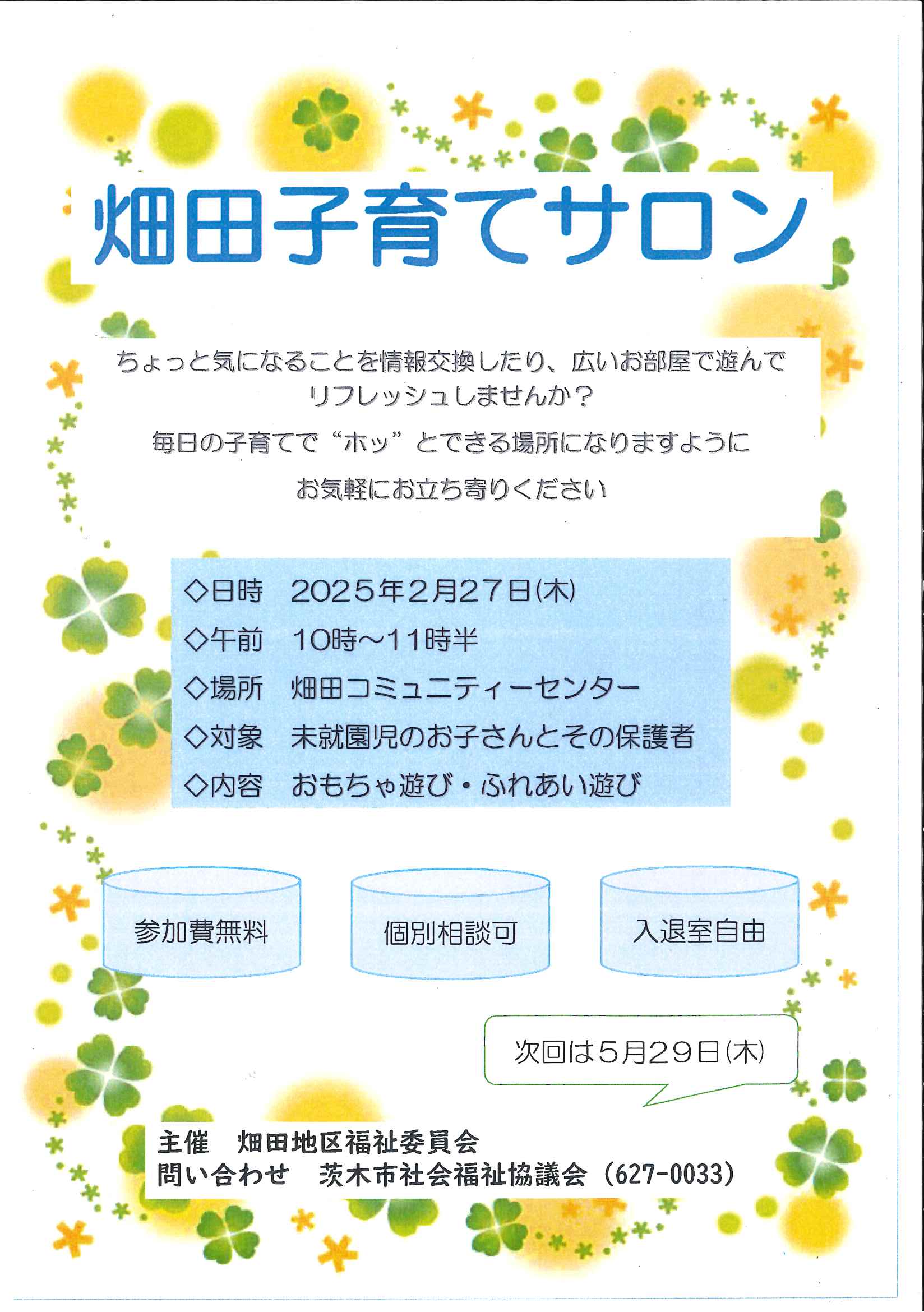 25.2.13 / 最終更新日時 : 25.2.13 茨木市社会福祉協議会 子育てサロン 畑田地区子育てサロン イベント詳細 日付: 25.2.27 10:00 AM – 11:30 AM カテゴリ: 子育てサロン