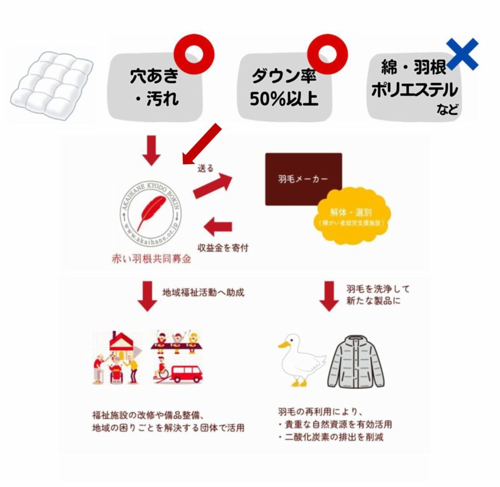 羽毛募金とは、不用になった羽毛製品を預かり、それを「回収・再利用する会社」へ売却し、その売却代金を全額共同募金会へ寄付をするという、募金とリサイクルを同時に行う仕組みです。
